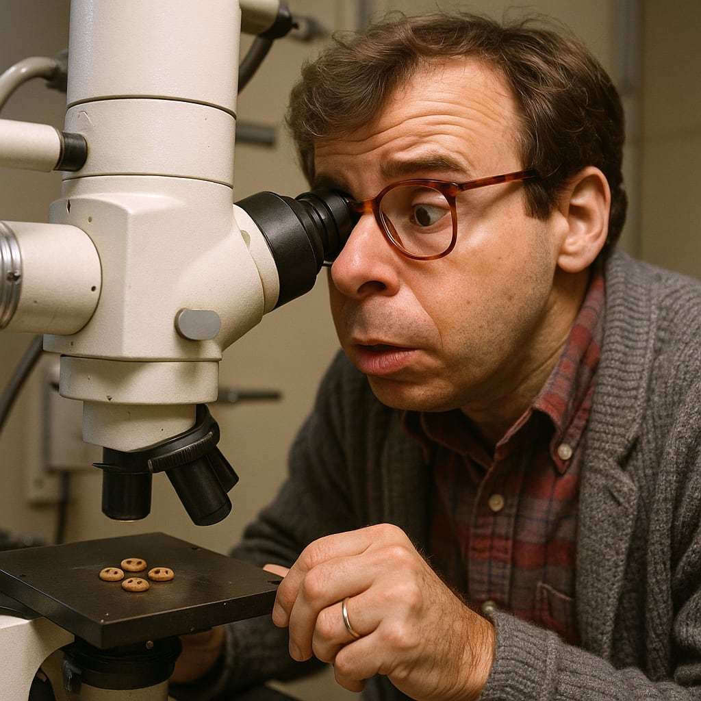 /showme Rick Moranis looking through electron microscope at the smallest cookies in the world.