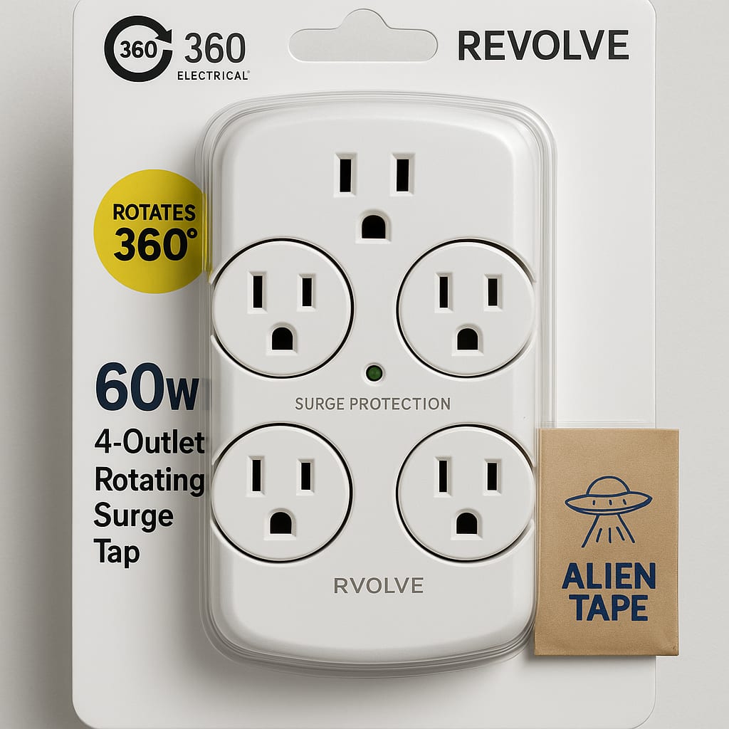 /showme mediocrebot packaging “360 Electrical Revolve 60W 4-Outlet Rotating Surge Tap” and adding a small envelope of alien tape into the package.