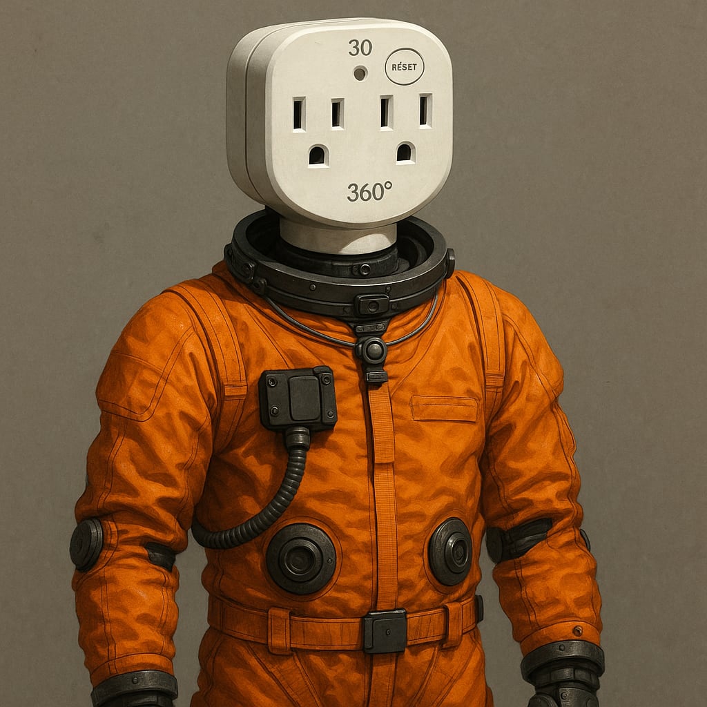 /showme Humanoid robot in orange spacesuit with head that looks like 360 Electrical Revolve 60W 4-Outlet Rotating Surge Tap.