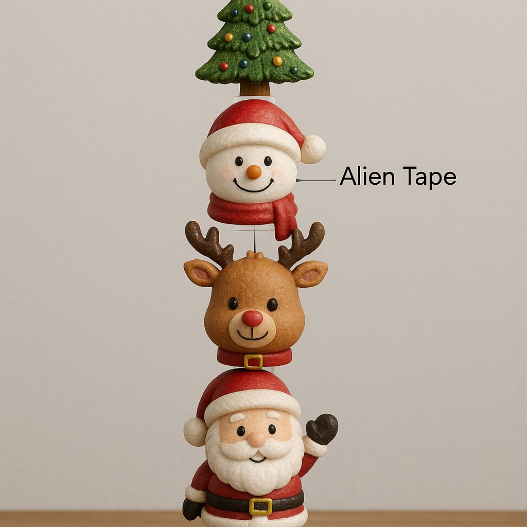/showme totem pole of XMas figurines stacked on top of each other using two-sided Alien Tape in between each figurine.