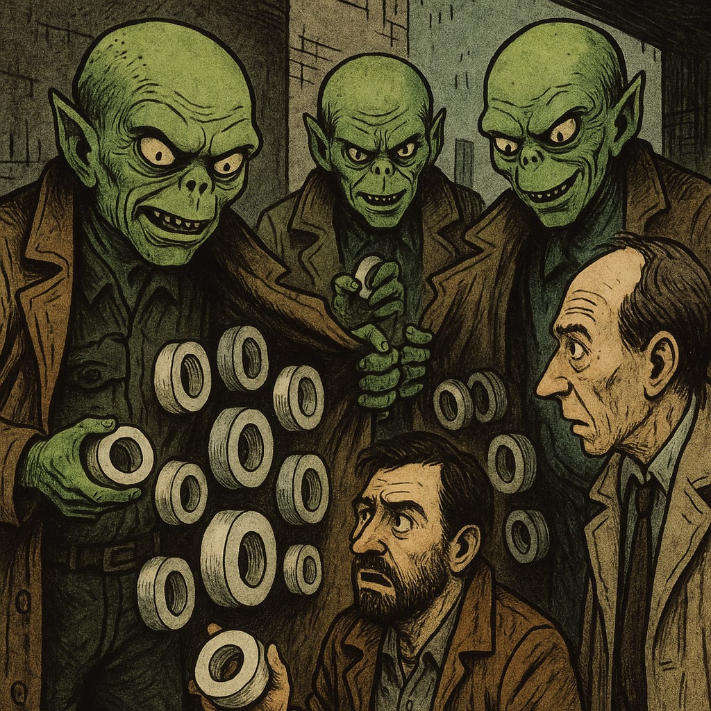 /showme Seedy looking green aliens with open trench coats selling rolls of tape to humans.