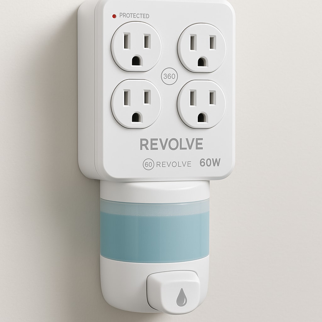 /showme 360 Electrical Revolve 60W 4-Outlet Rotating Surge Tap that is also wall mounted soap dispenser.