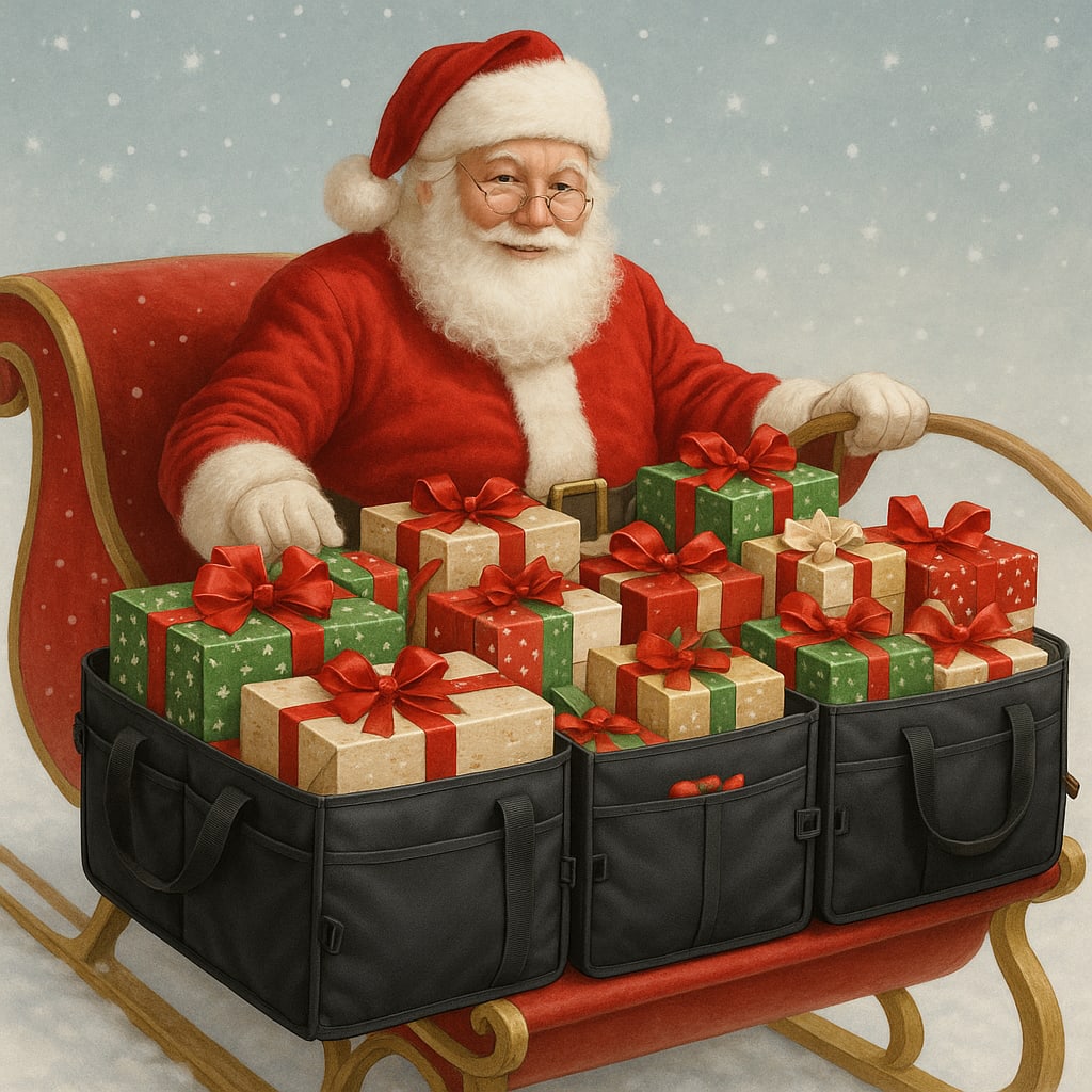 /showme Santa Claus using Expand-to-Fit Car and SUV Trunk Organizers to hold presents in his sleigh.