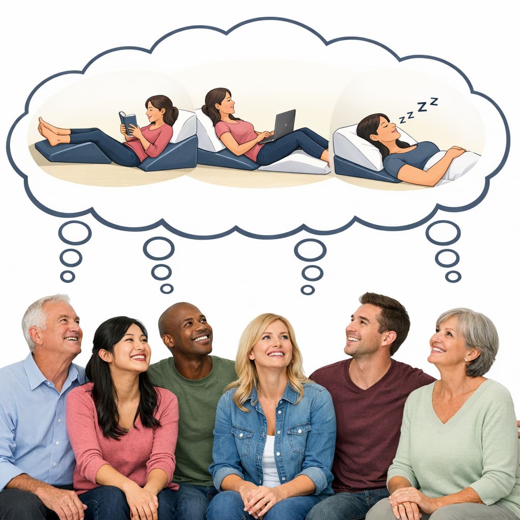 @zippyus Here’s the image you requested for “six people sharing the same thought bubble showing what a wedge pillow is for, safe for work.”