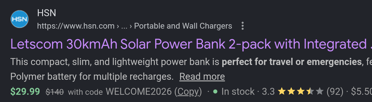 That said, this no-name power bank is suspicious in terms of capacity and also of the solar panels, and the price is super low. If it comes anywhere near meeting its specs you’ve done great. I’m resisting.