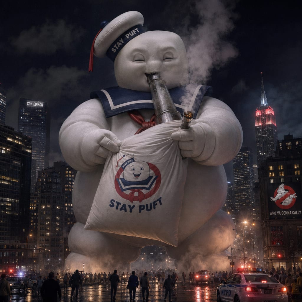 @zippyus Here’s the image you requested for “stay-puft marshmallow man ghostbusters towering over downtown and using a pillow as a bong”