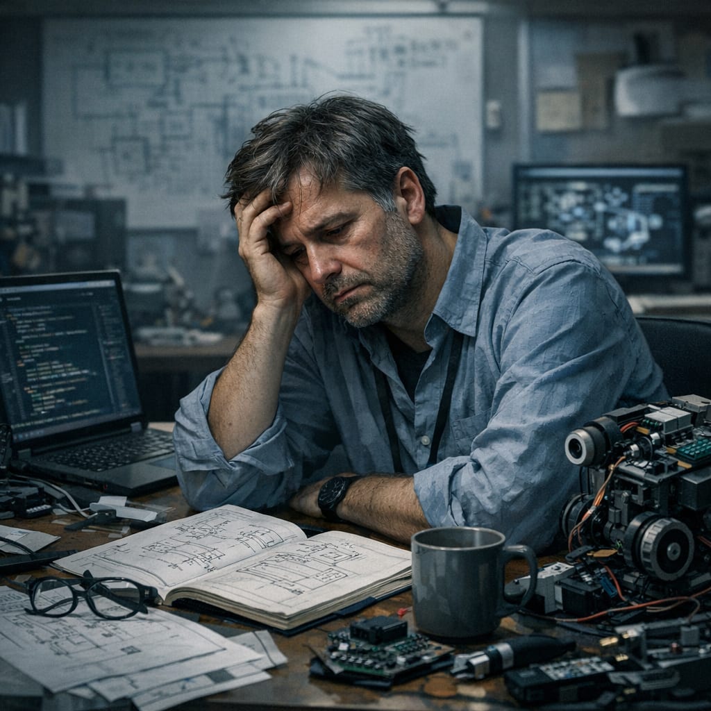 @mediocrebot@SSteve Looks like he just got a call from his boss saying that the marketing people want this new thing made cheaper, so the most important feature is going to have to be deleted.