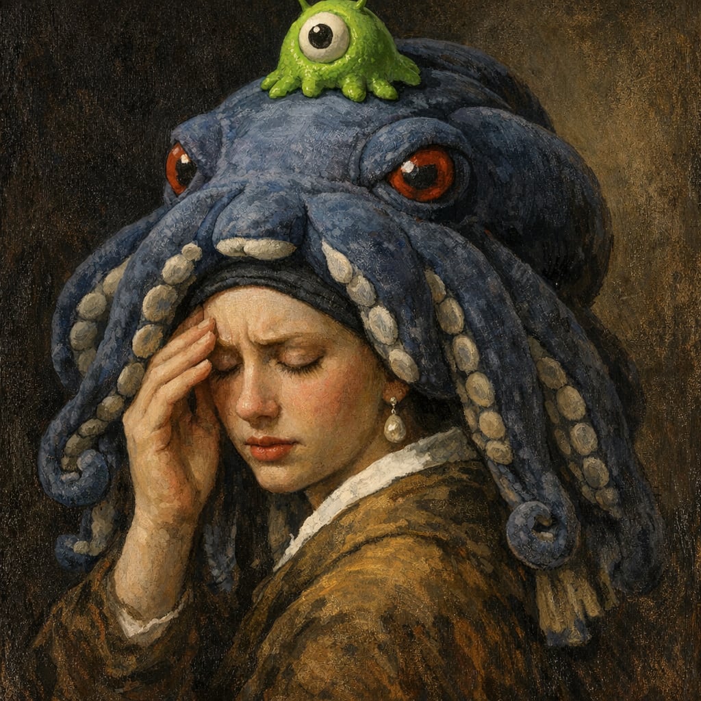 /showme migraine sufferer wearing large migraine therapy support octopus on their head, Futurama brain slug on octopus’s head, style of girl with a pearl earring