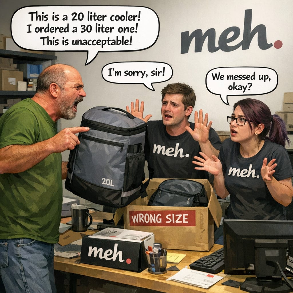 /showme a customer outraged at meh.com employees over getting a 20 liter backpack cooler instead of a 30 liter