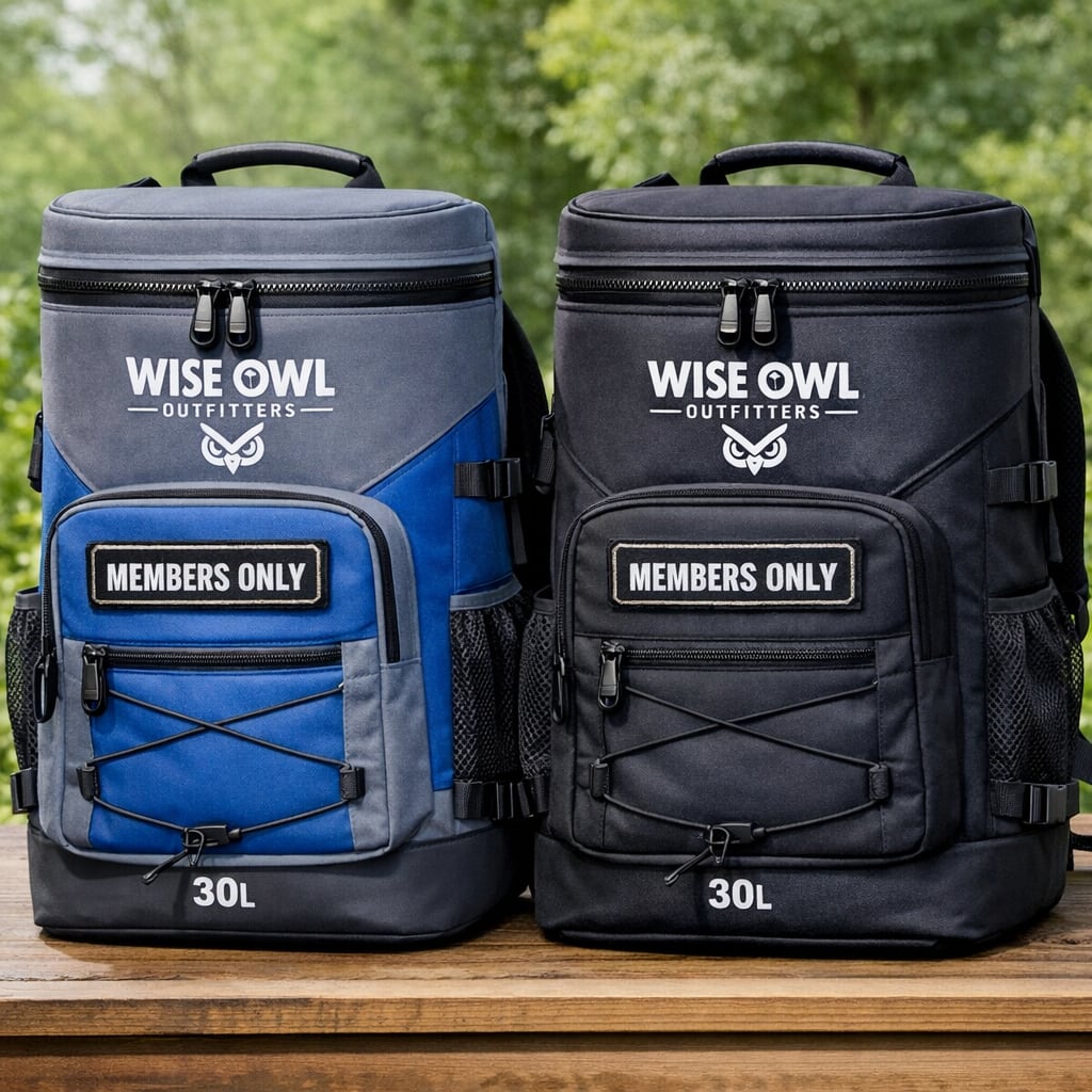 @therealjrn Here’s the image you requested for “a pair of Wise Owl Outfitters 30-Liter Backpack Coolers with a members only label”