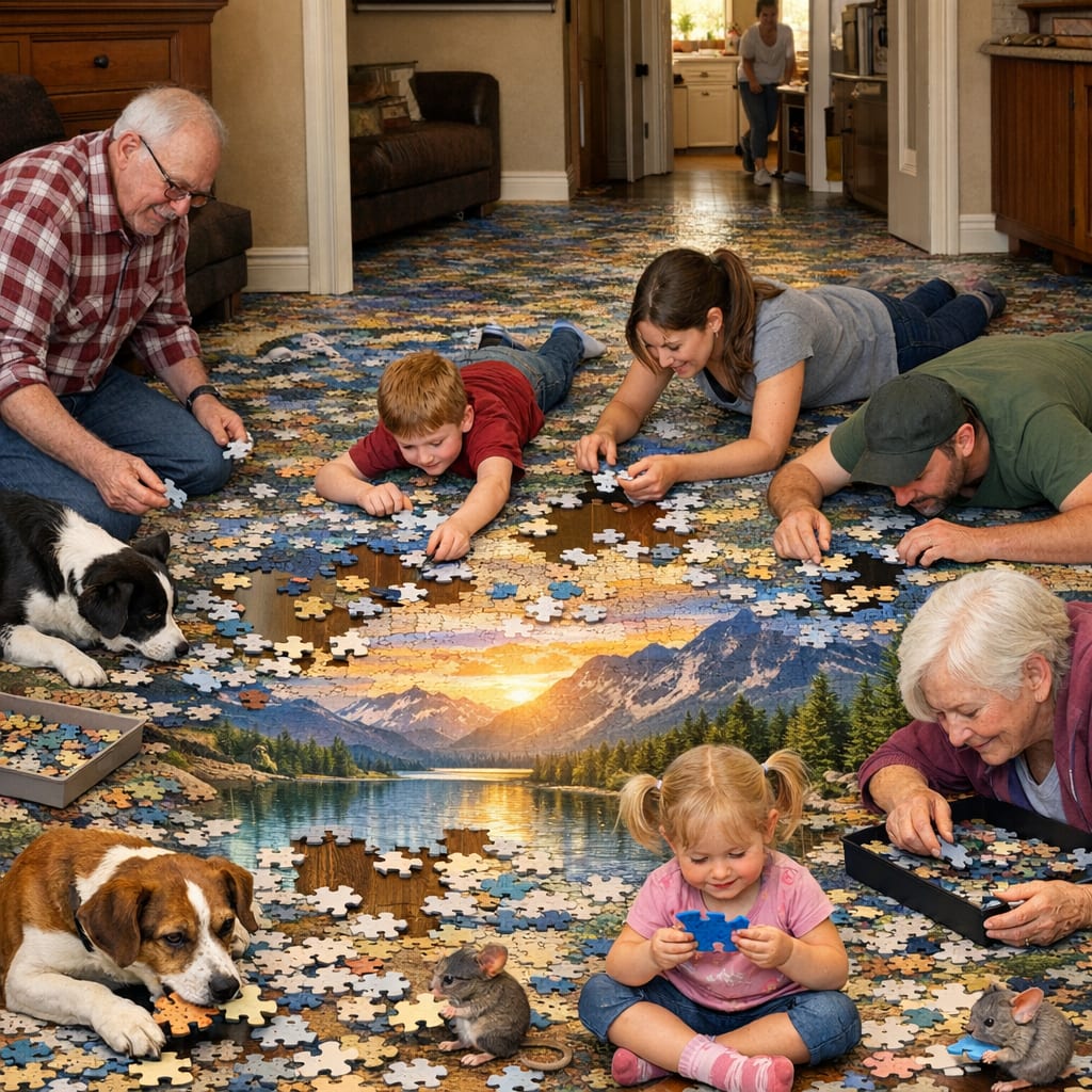 /showme 25000 piece puzzle covering floor of house. Humans, cats, dogs, and mice are trying to fit puzzle pieces into incomplete parts of the puzzle.