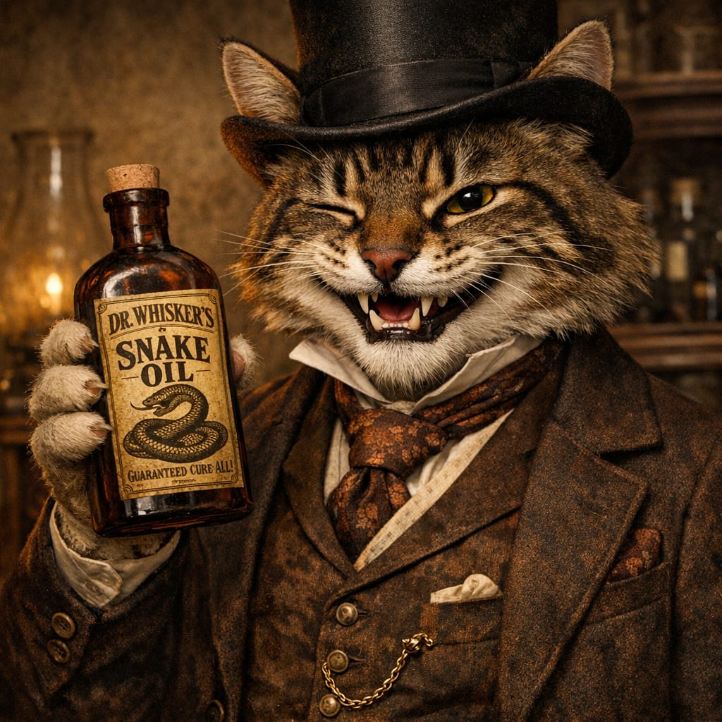 @cfg83 Here’s the image you requested for “Anthropomorphized cat in Victorian business suit holding bottle of snake oil and grimacing with a…”