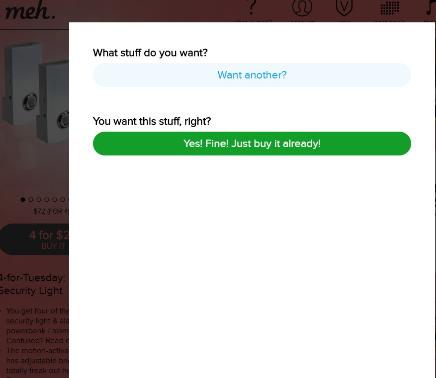 @donrull if Meh didn’t occasionally throw in a can’t resist item (coincidentally at least once a month) then I’d likely cancel after a few months of dry. We get a hell of a lot more measurable benefit from the $100 Prime fee than this $60 Meh fee.