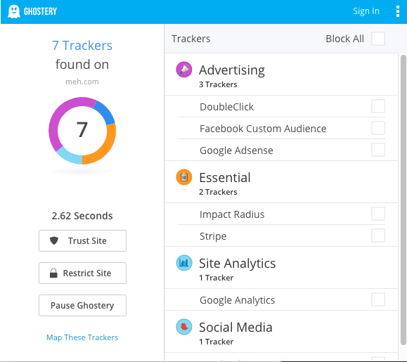 Meh is admittedly pretty innocent with only seven mostly well-known companies, but I doubt the sites with 35-40 trackers on each page have any clue what sewage they are funneling up our urethras.