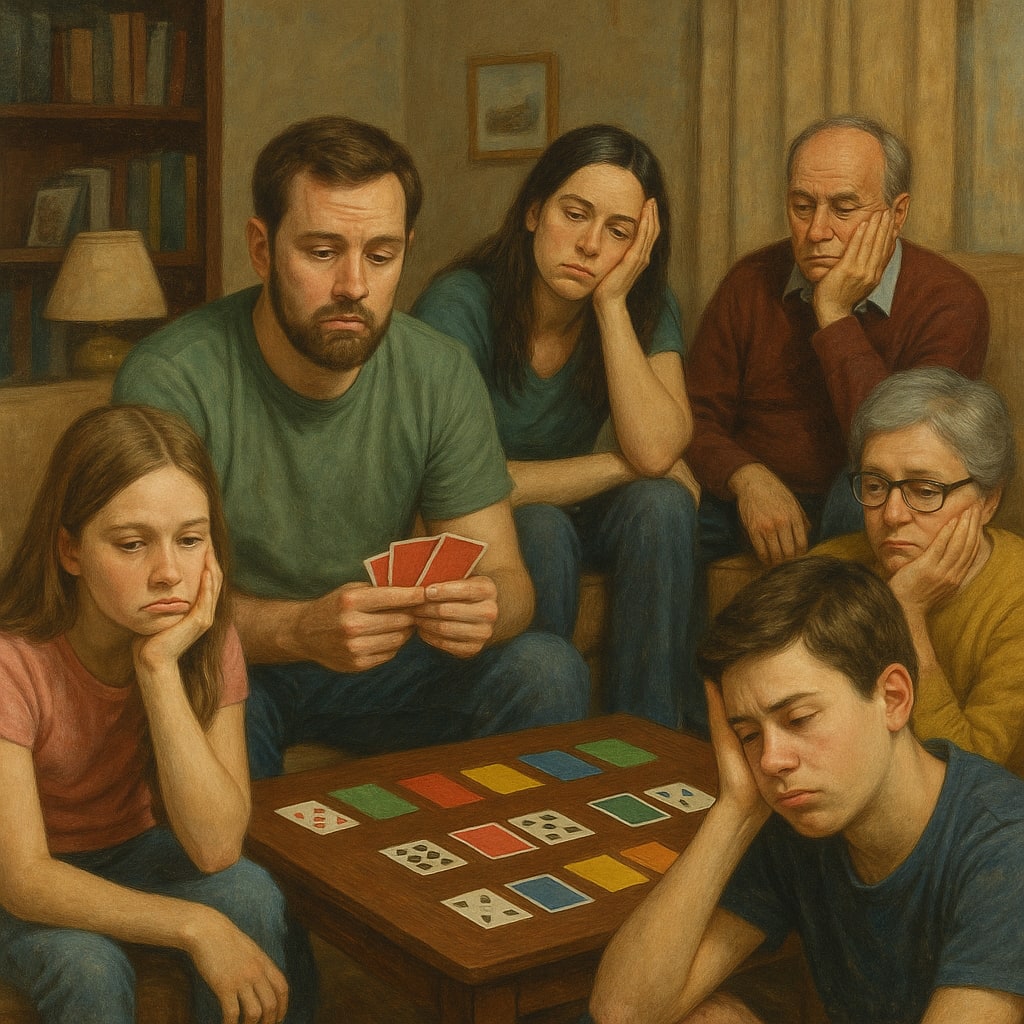/showme a room full of family members bored to tears with a card game that Chad brought.