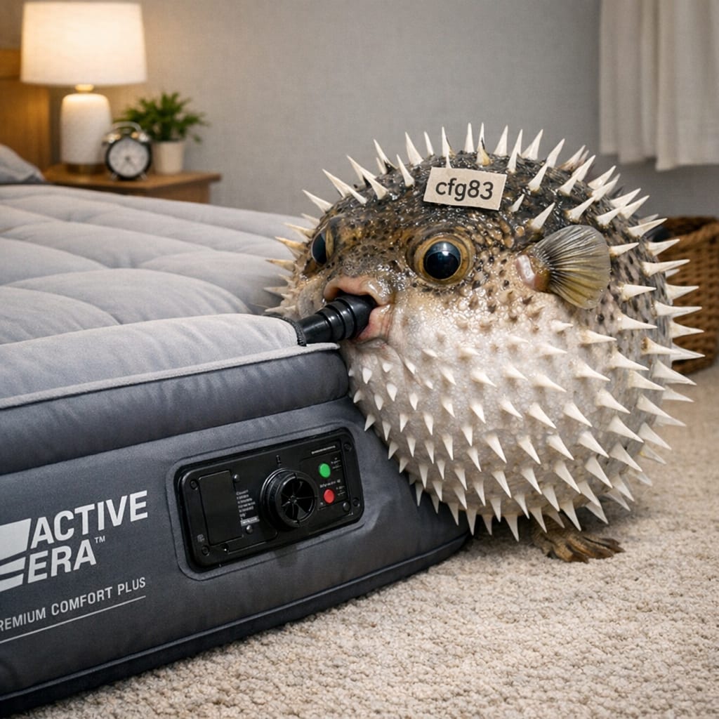 @cfg83 Here’s the image you requested for “Pufferfish named cfg83 trying to inflate Active Era Premium Comfort Plus Air Mattress”