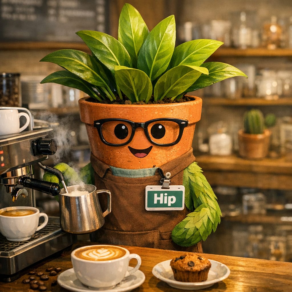 @cfg83 Here’s the image you requested for “Anthropomorphized plant working in coffee shop and has badge that says Hip.”