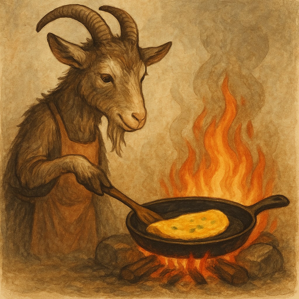 /showme A goat cooking an omelette in a cast iron skillet over an open fire.