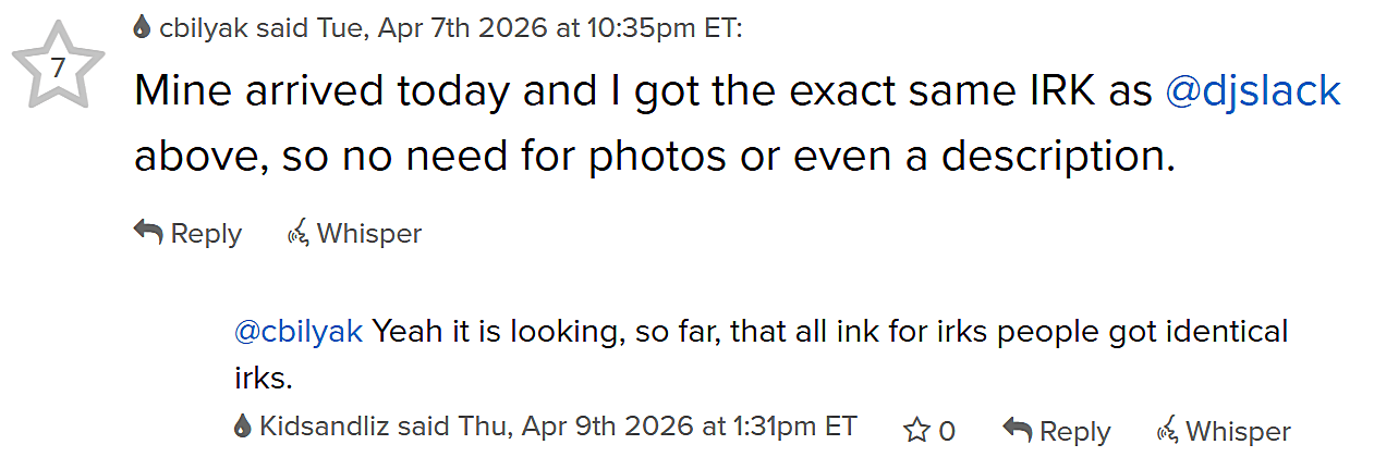 @cbilyak Yeah it is looking, so far, that all ink for irks people got identical irks.