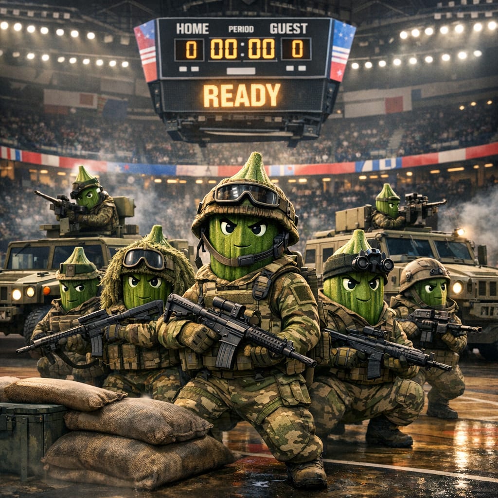 @jo2y Here’s the image you requested for “a platoon of okra in combat ready military gear and vehicles. They should be in a sports arena wa…”