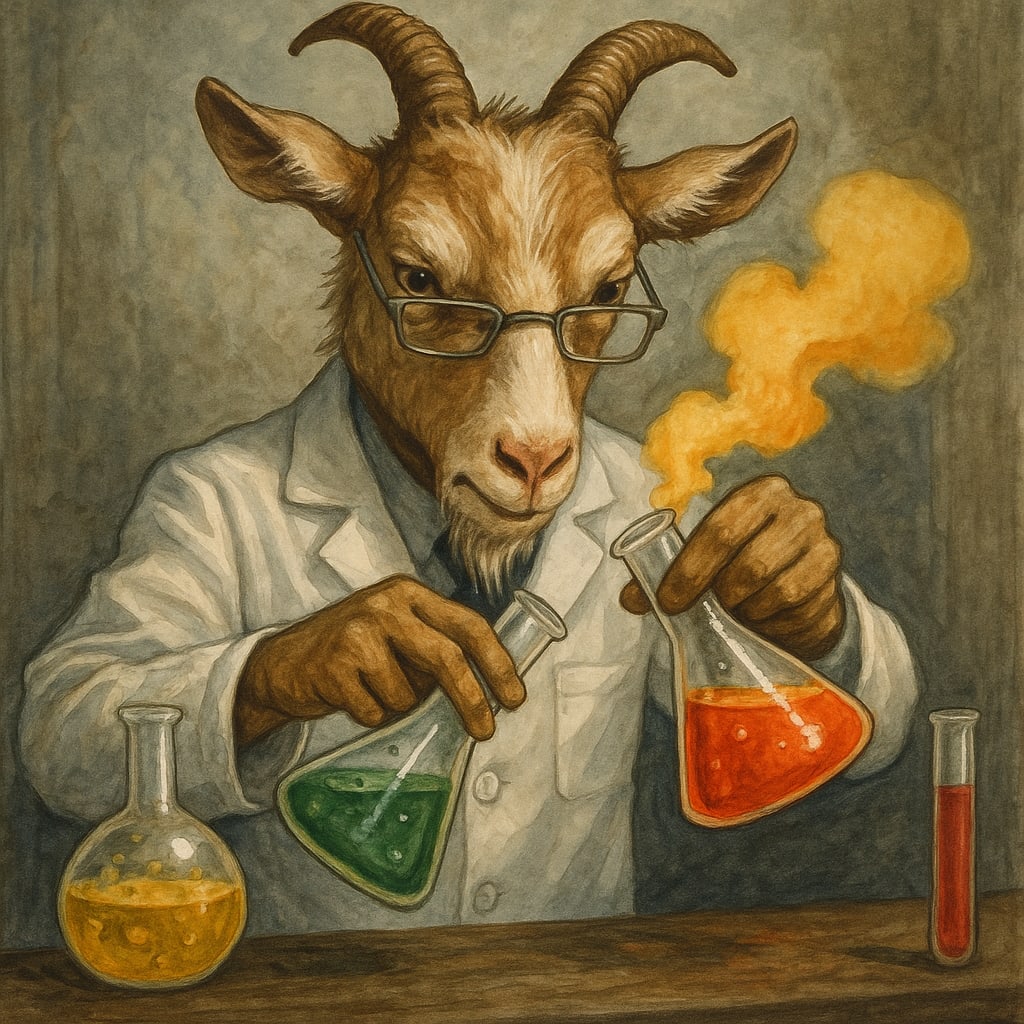 /showme A goat in a lab coat, mixing dangerous chemicals in beakers.