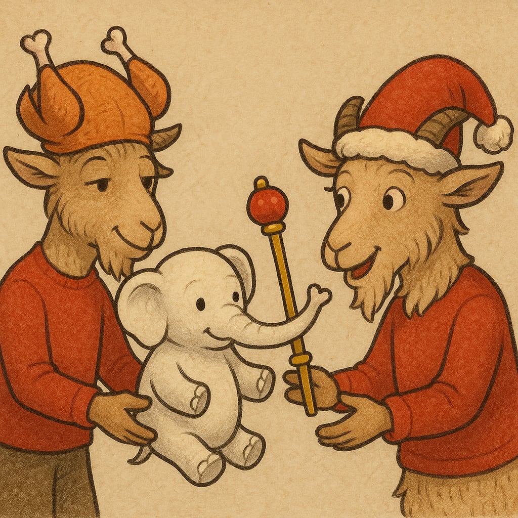 /showme anthropomorphized goat wearing turkey cap gives white elephant holding a scepter with its trunk to another goat wearing a Santa Claus cap.