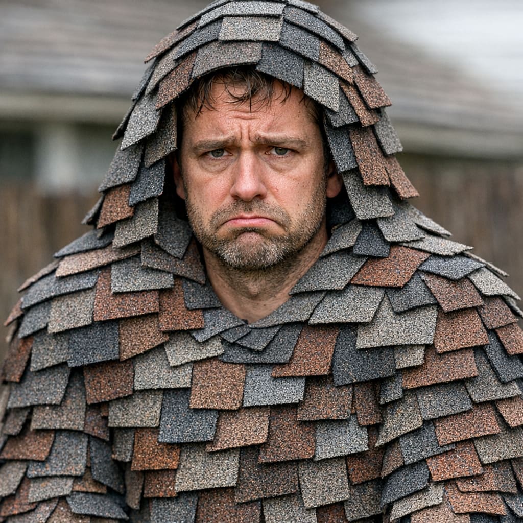 @cfg83 Here’s the image you requested for “Unhappy human covered in little roof shingles.”