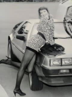 @f00l @Kyeh @therealjrn @unksol This photo was taken a bit before we started dating. It was for a ( humorous) promotional flyer that was sent out to the sales offices of the big tech company where we both worked. The DeLorean she’s leaning on was owned by one of the managers in her marketing department. She even had a company photo ID badge made with this character and the name “Trixie”. (We also have a life-sized poster of this shot.