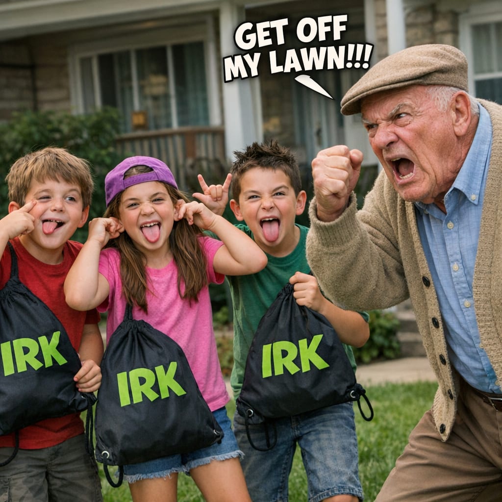 /showme kids holding IRK bags and making faces at grumpy old man telling them to “GET OFF MY LAWN!!!”.