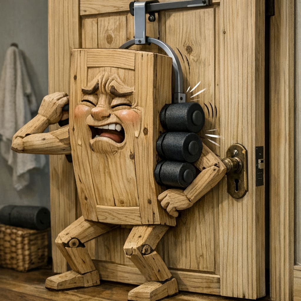 @zippyus Here’s the image you requested for “anthropomorphic unpainted wooden door using a door mounted back roller to work out the knots.”