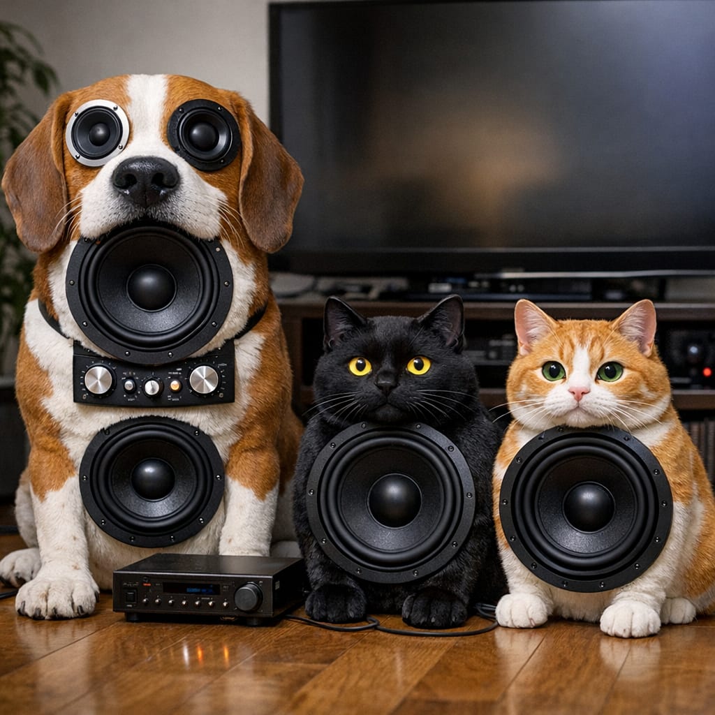 /showme dogs and cats as the speaker and subwoofer for a sound system
