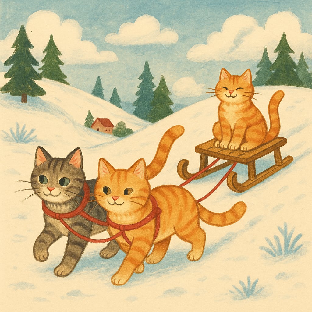 @mediocrebot aww, that’s much better bot! But I haz kats. /showme a playful idyllic sled being pulled by 2 cats