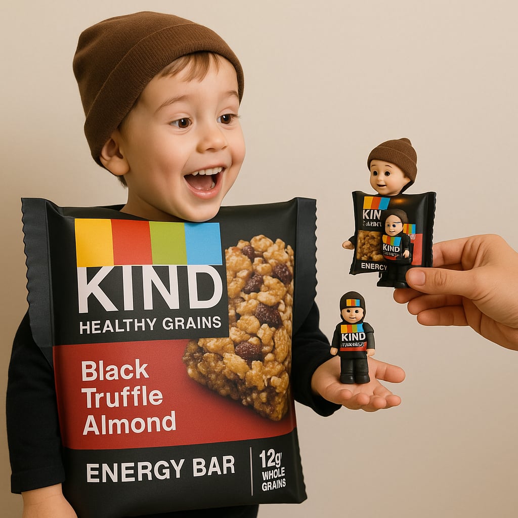 /showme child dressed as KIND Healthy Grain Energy Bar while receiving figurine of child dressed as KIND Healthy Grain Energy Bar as a treat