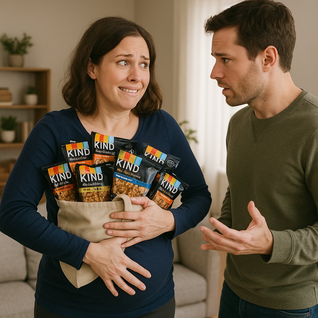 /showme a wife desperately trying to hide an abundance of KIND Healthy Grain Energy Bars from her husband under her shirt while telling him she’s pregnant.