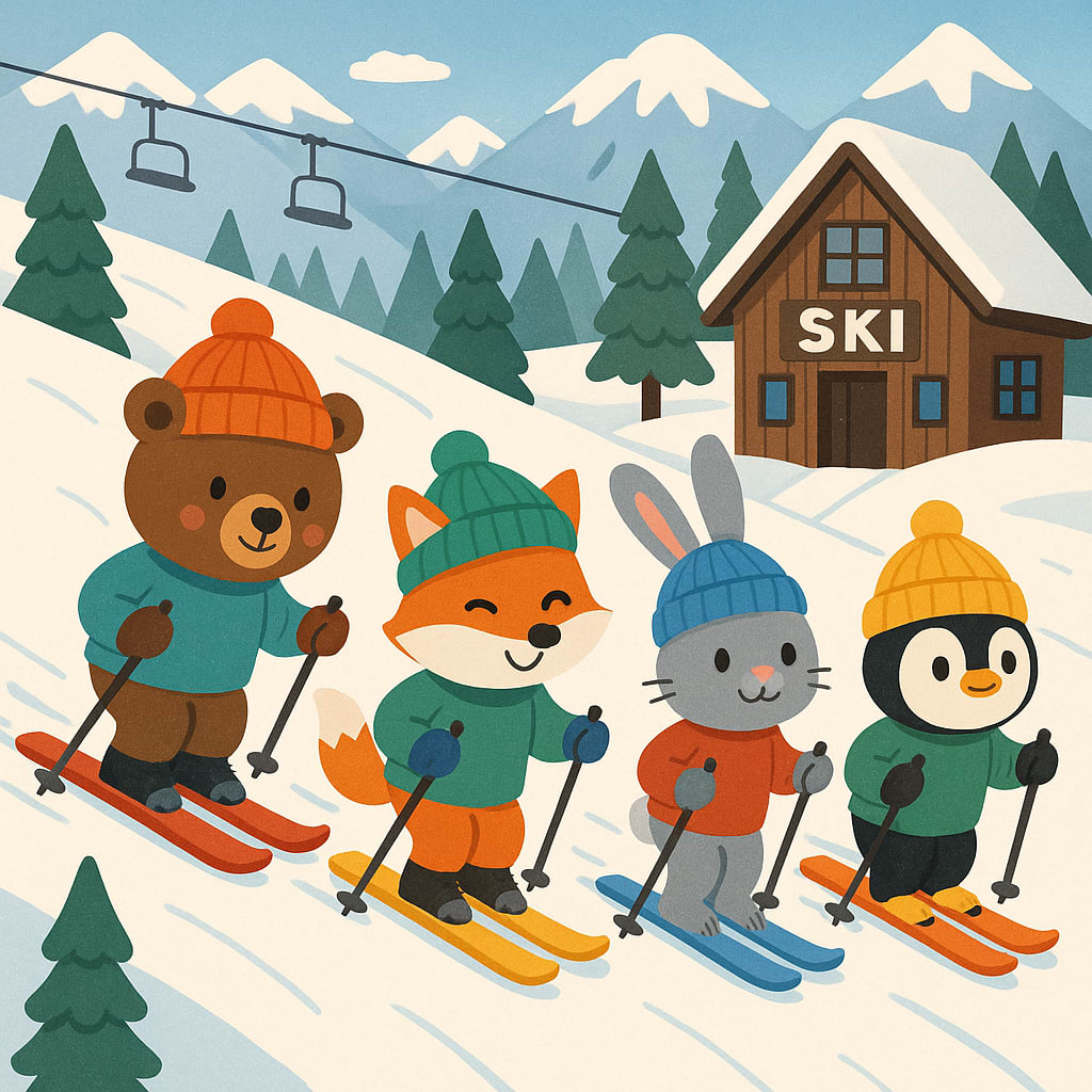 /showme animals wearing different color beanies skiing at ski resort.