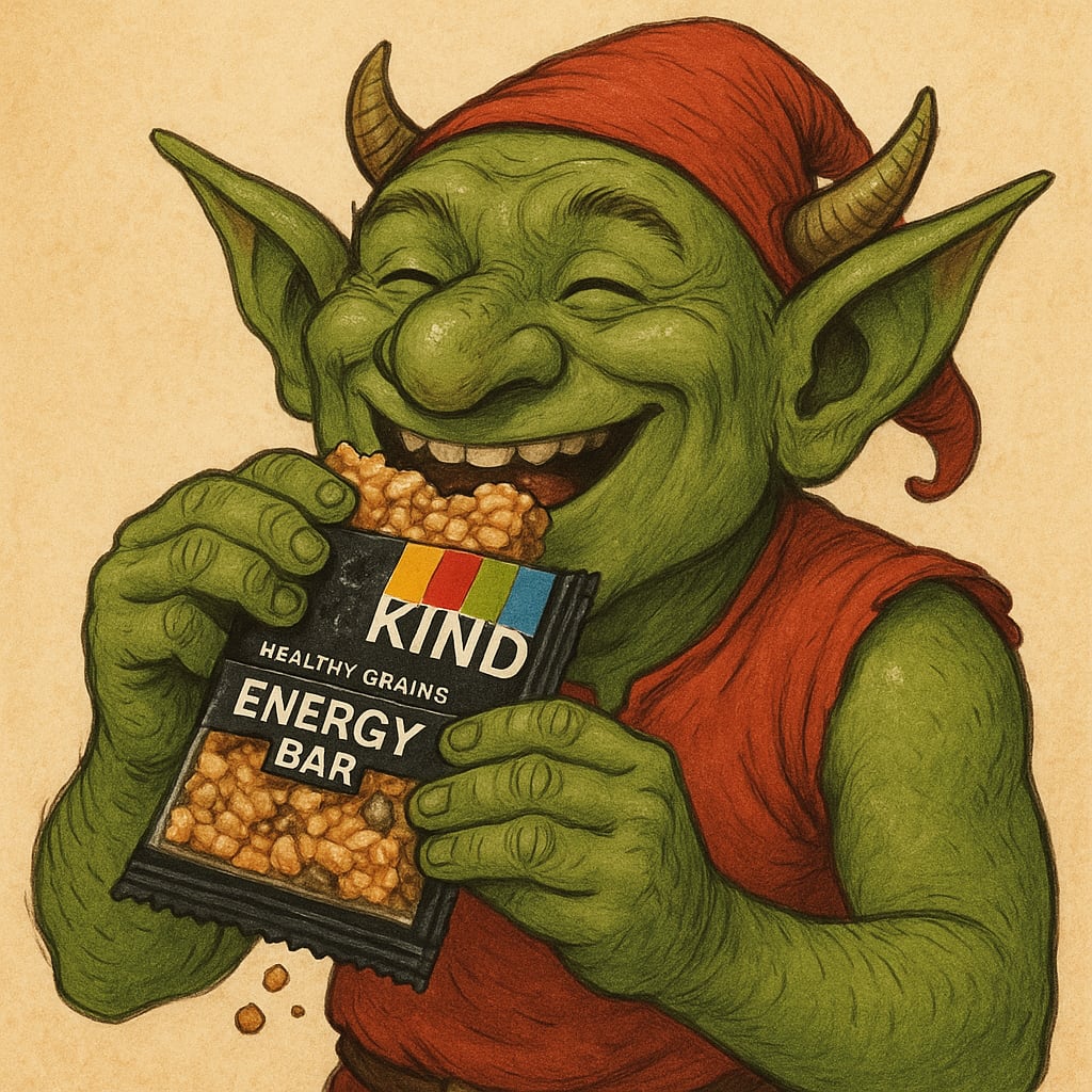 /showme happy hobgoblin eating KIND Healthy Grain Energy Bar.