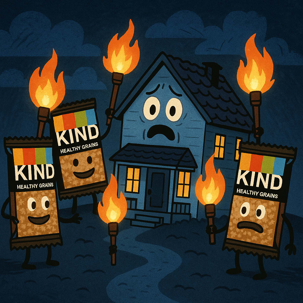 /showme KIND Healthy Grain Energy Bars holding torches and surrounding scared-jittery-house.