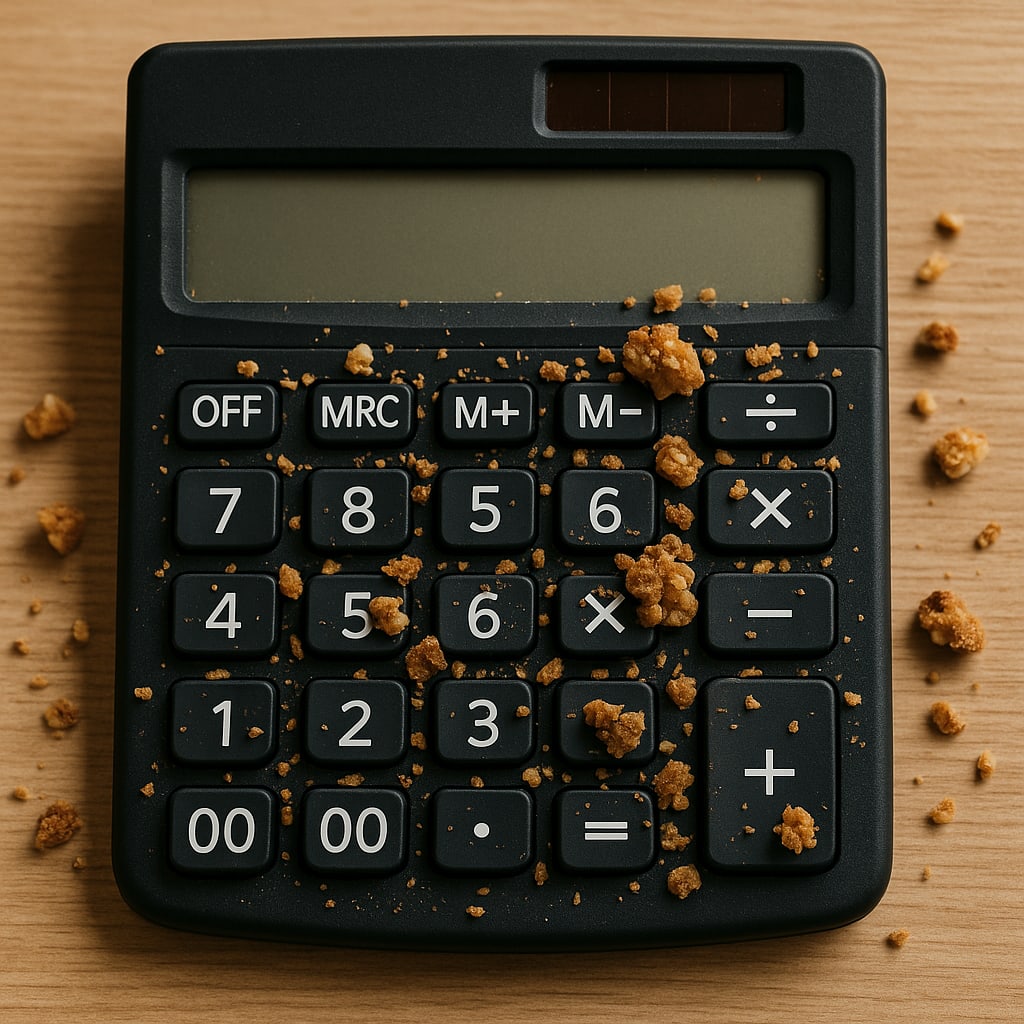 @mediocrebot /showme a calculator with the granola bits splattered all over it but with proper calculator buttons. I need a real 0, not a double zero (this isn’t roulette) and a true #9 key. Your last calculator rendering was crazy.
