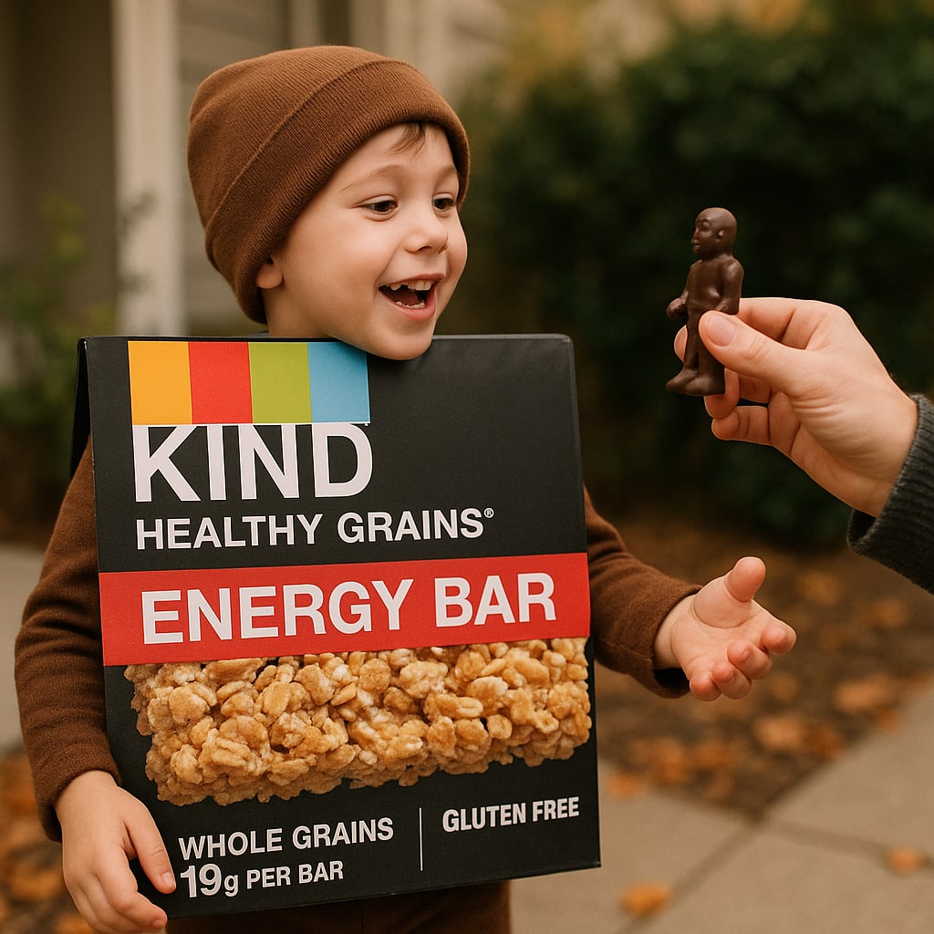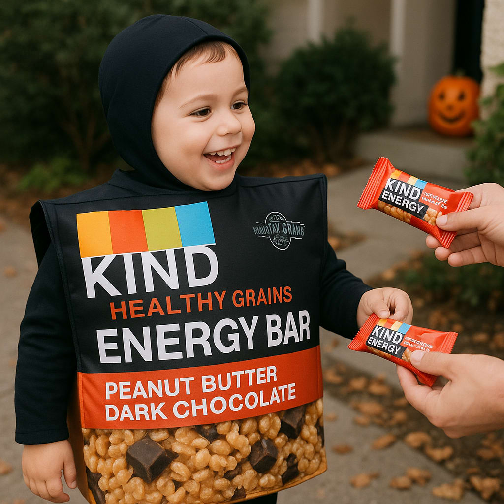 /showme child dressed as KIND Healthy Grain Energy Bar while receiving KIND Healthy Grain Energy Bar as a treat.