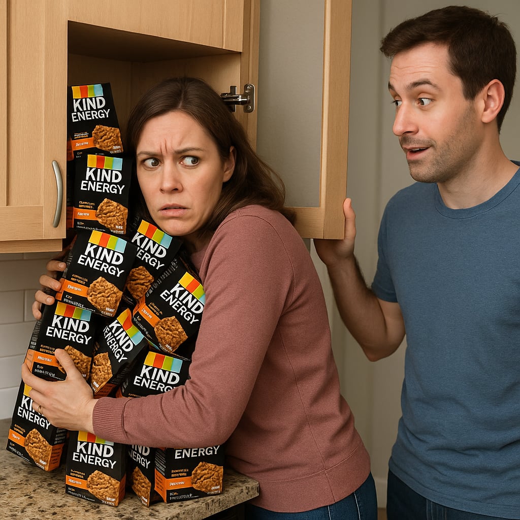 /showme a wife desperately trying to hide an abundance of KIND Healthy Grain Energy Bars from her seemingly oblivious husband
