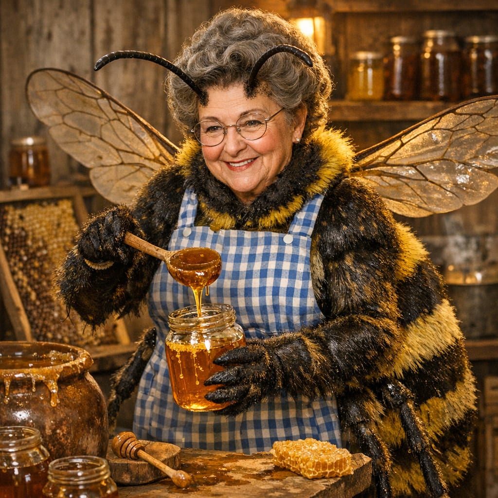 @cfg83 Here’s the image you requested for “Aunt Bee Taylor from the Andy Griffith show is making honey and is actually a bee the size of a h…”