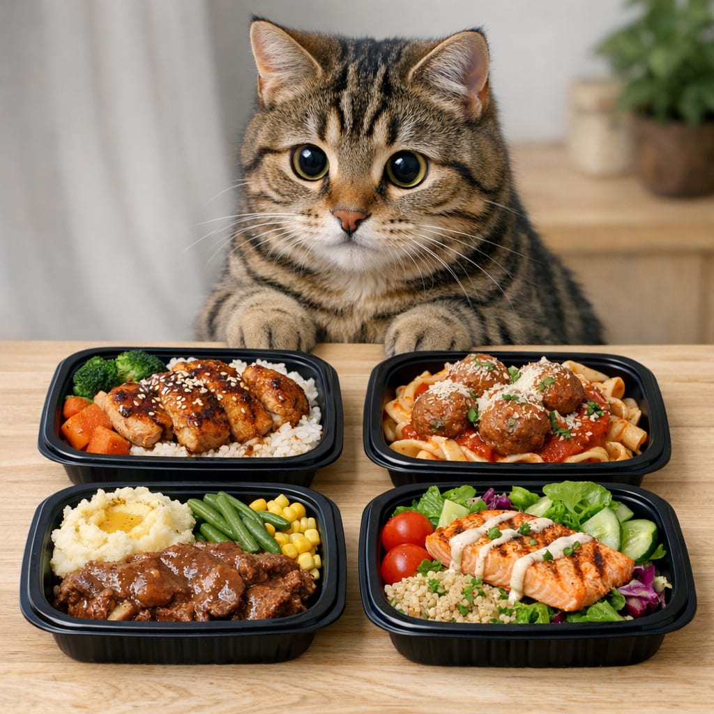 @cfg83 Here’s the image you requested for “Cute cat looking at 4 little pre-made meals.”