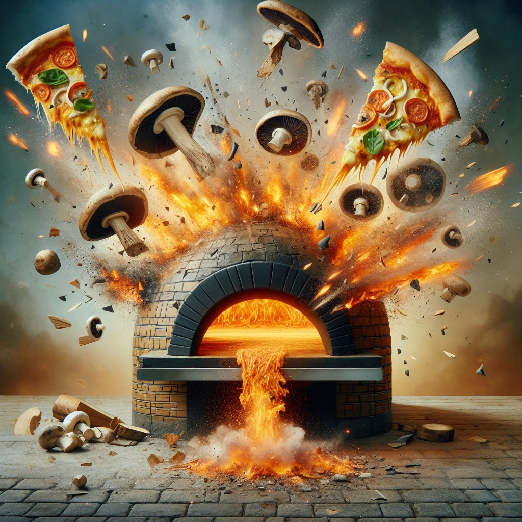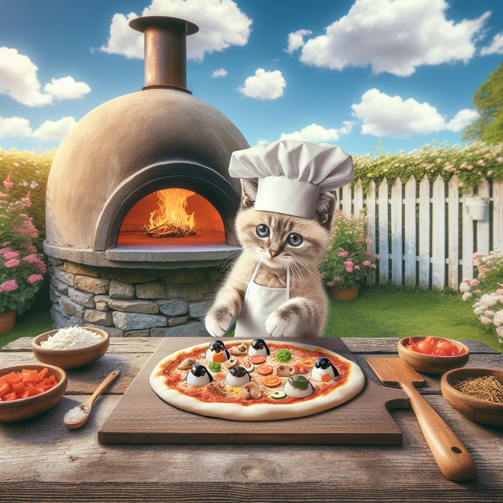 /showme a cat making a penguin pizza in an outdoor pizza oven