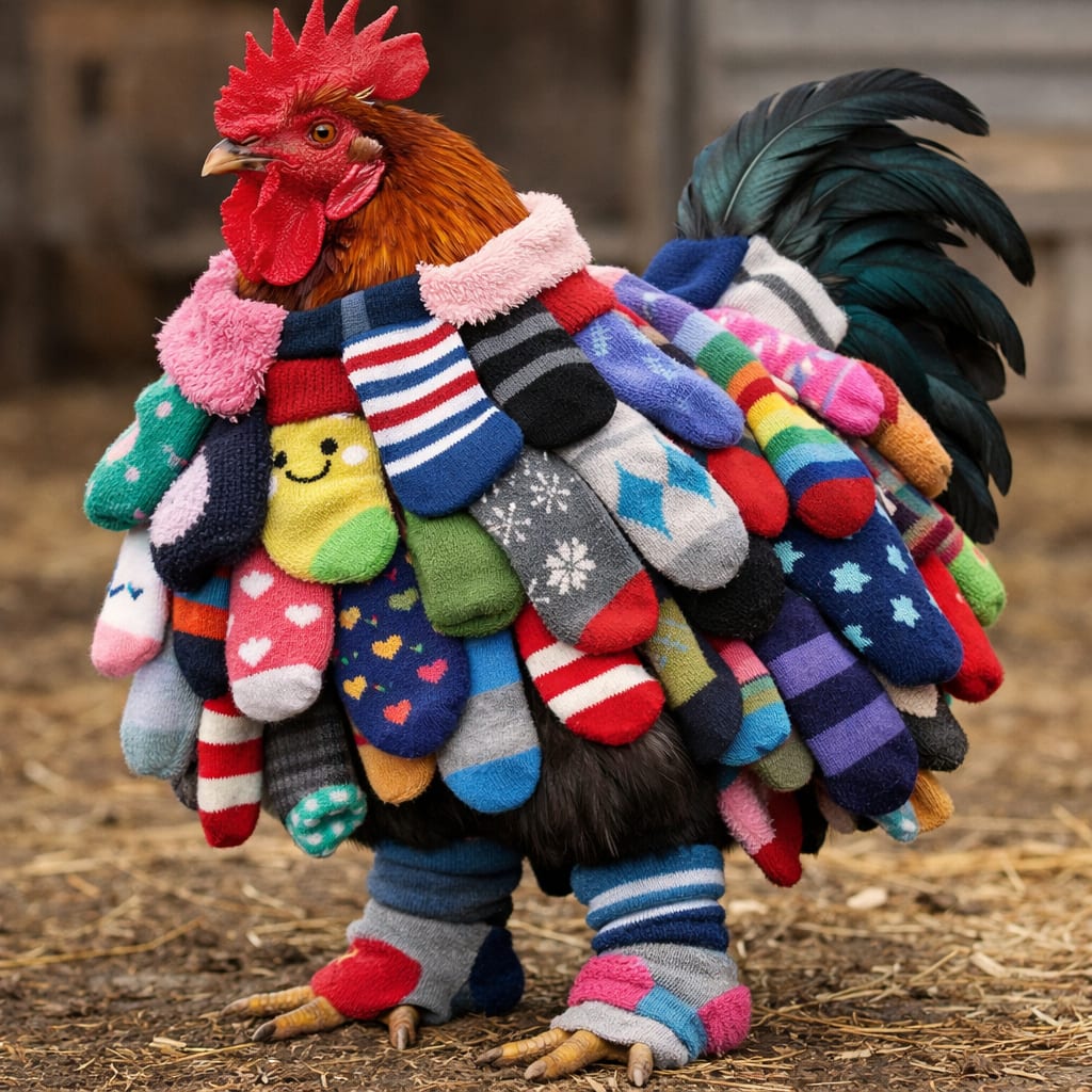 /showme a Rooster (cock) wearing a bunch of donated Socks.