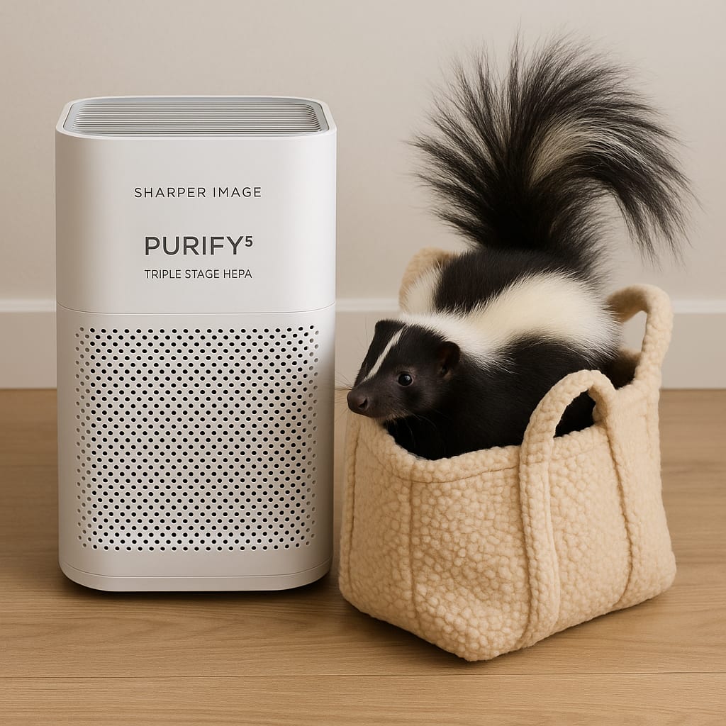 /showme Sharper Image by Vornado PURIFY 5 Triple Stage HEPA Air Purifier neutralizing the smell of a skunk sitting in a Sherpa Trek Tote.