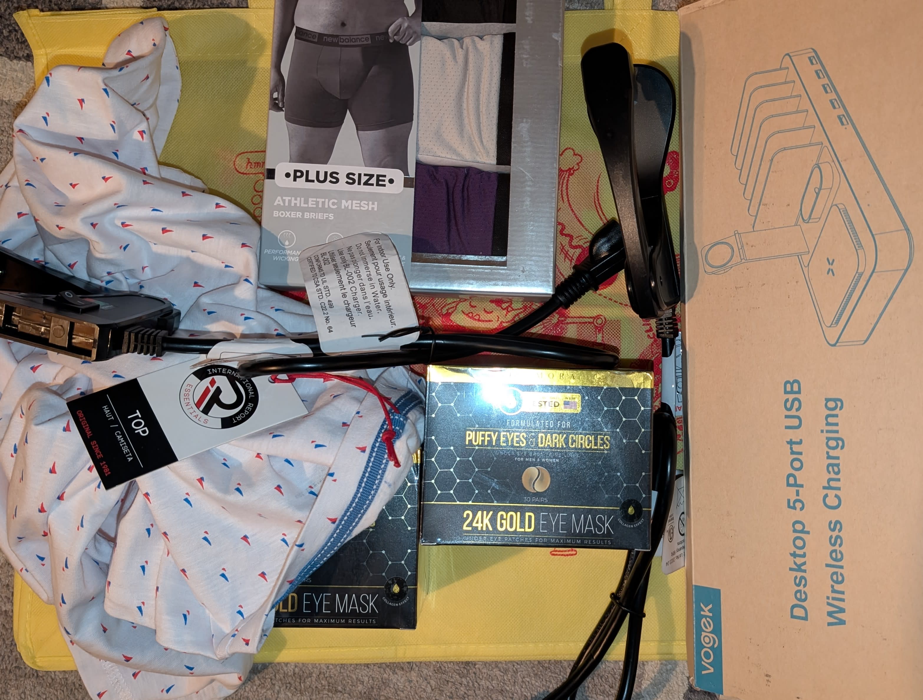 First one - full length Kenneth Cole puffer coat, size M. Fits me but I’ll probably donate it to a coat drive, I already have a similar coat. Nice, though. Desktop wireless charger, 2 boxes of gold under-eye patches, a Julep lip gloss (those are great, score!) Oh, and a yellow Irk bag!