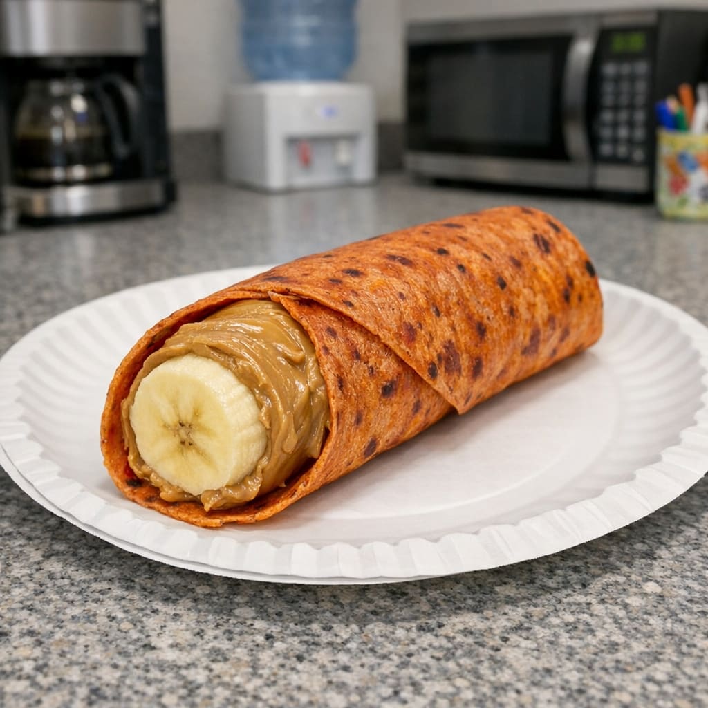 /Showme a burrito consisting of a whole banana that has been covered with peanut butter made with a sun-dried tomato tortilla it should sitting on a paper plate in an office break room.