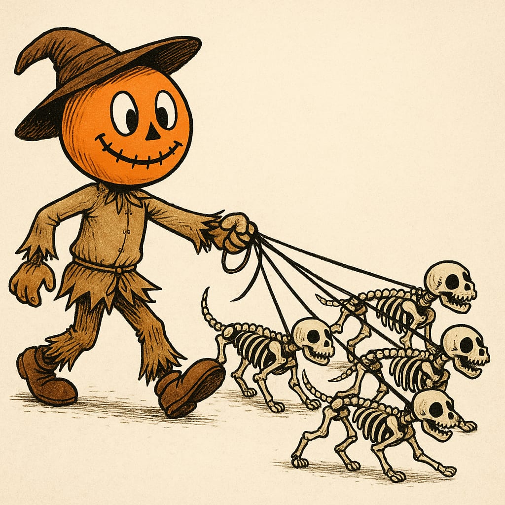 /showme a strawman with a cartoon head walking 5 skeleton dogs
