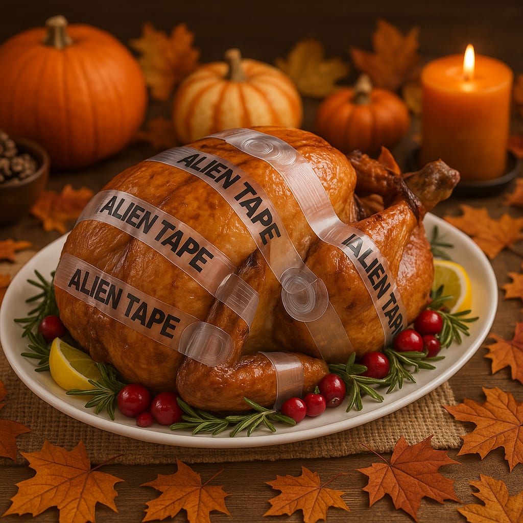 /showme a thanksgiving turkey being held together with Alien Tape and have it on a serving platter on a table decorated with pumpkins and thanksgiving decorations.