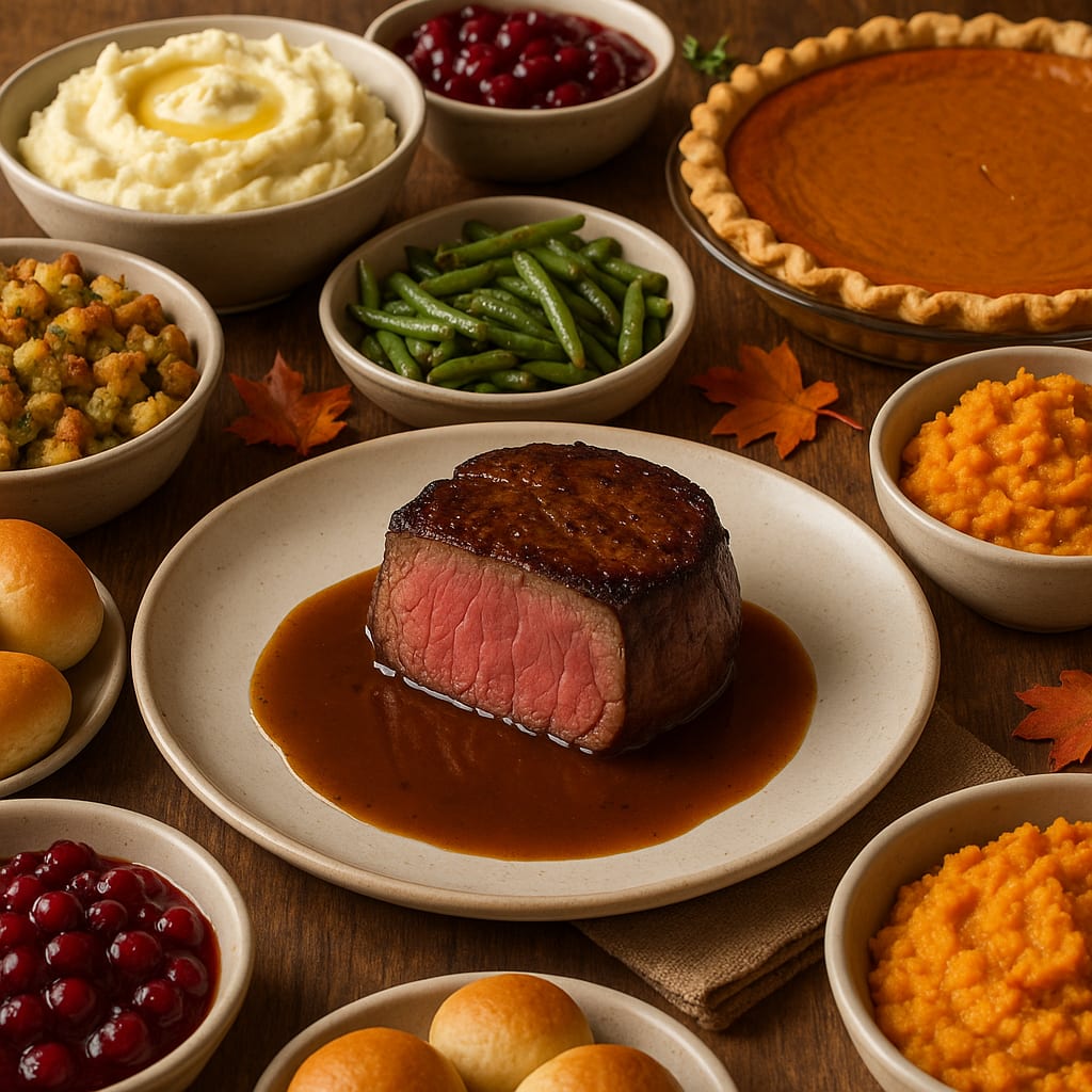 /showme a Thanksgiving feast but instead of turkey there is filet mignon
